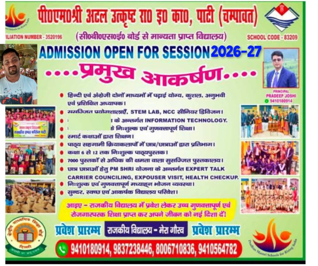 About PM Shri Pati: Govt Inter College Pati was estabished in 1985 as a high school. It is located in district Champawat, Uttarakhand a hill area in himalayan region. School has a wide and attractive campus and has total registered land 12900 sq meter / 3.5 acre. In 2000 it was upgraded as Intermediate, in 2013 it was selected as a model school and later on 2021 under state government policy of converting selected ongoing school to Atal Utkrisht, which is cbse affiliated schools. Govt inter college pati renamed as Atal Utkrisht Government Inter College Pati.